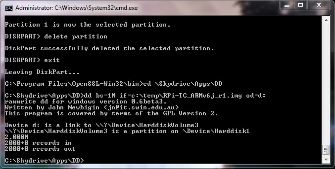 - Insert your SD card and wipe out all partitions on it. I'll assume you know how for Linux; in Windows use Diskpart: Diskpart (Enter), List Disk (Enter), Select Disk X (Enter), List Partition (Enter), Select Partition X (Enter), Delete Partition (Enter). Repeat list, select, delete for each partition on the SD card then Exit (Enter). Make sure you don't execute this sequence on any other drives or you will loose all your data!